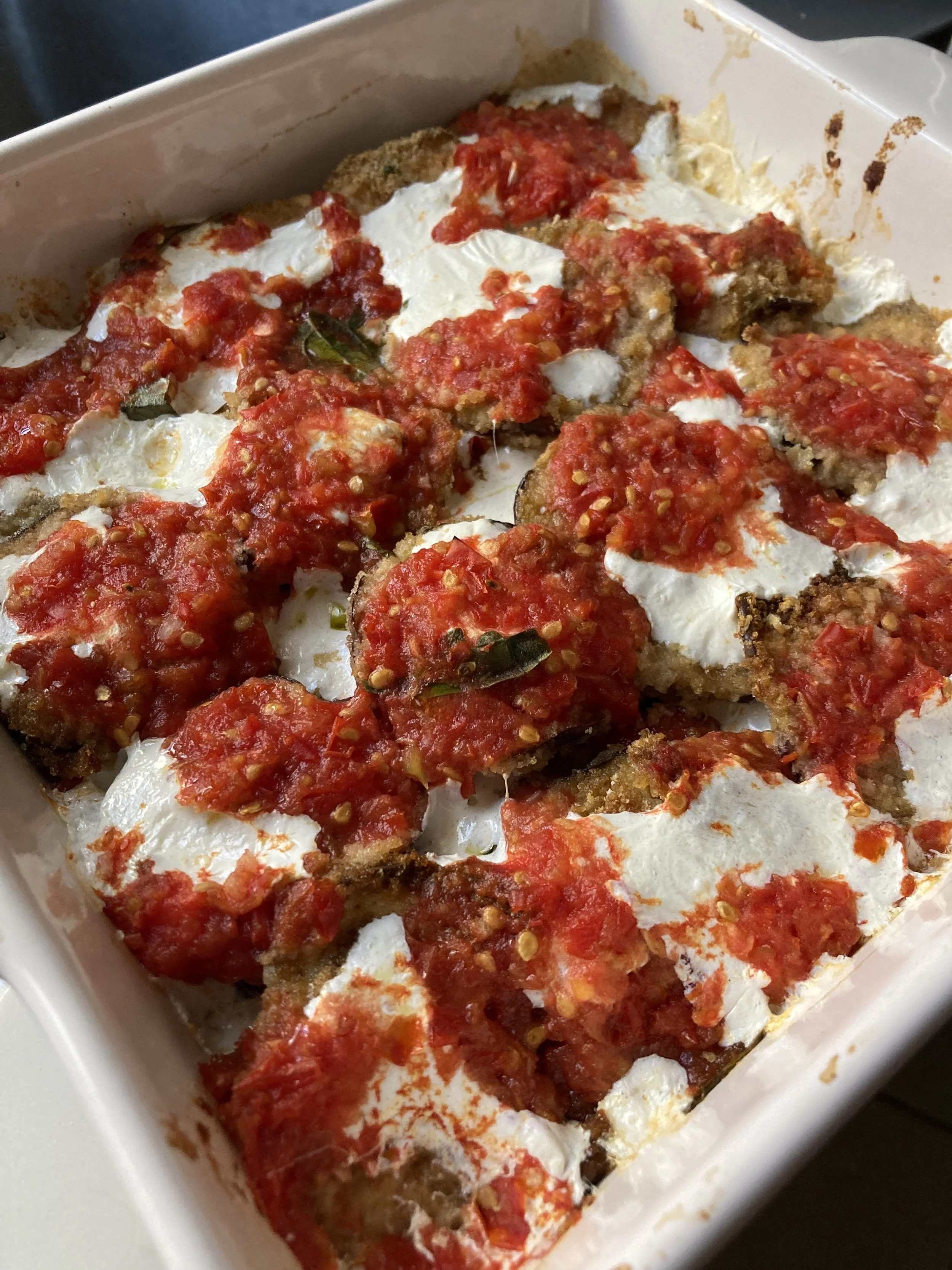 Coat the bottom of a 9x13 baking dish with your tomato sauce and add a layer of the eggplant, then add your grated mozzarella and another layer of sauce