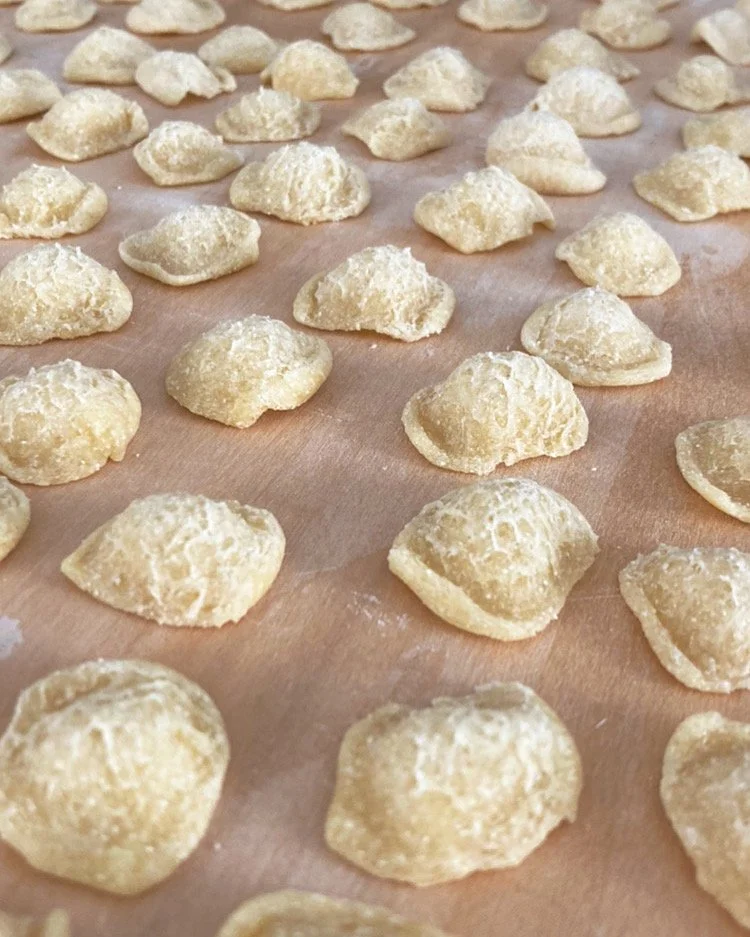 If you buy good quality pasta at the store, it should only contain two ingredients, durum wheat semolina and water. This is the traditional pasta dough you will find all over Southern Italy. This dough is used for shorter pastas like cavatelli, orecchiette or capunti.